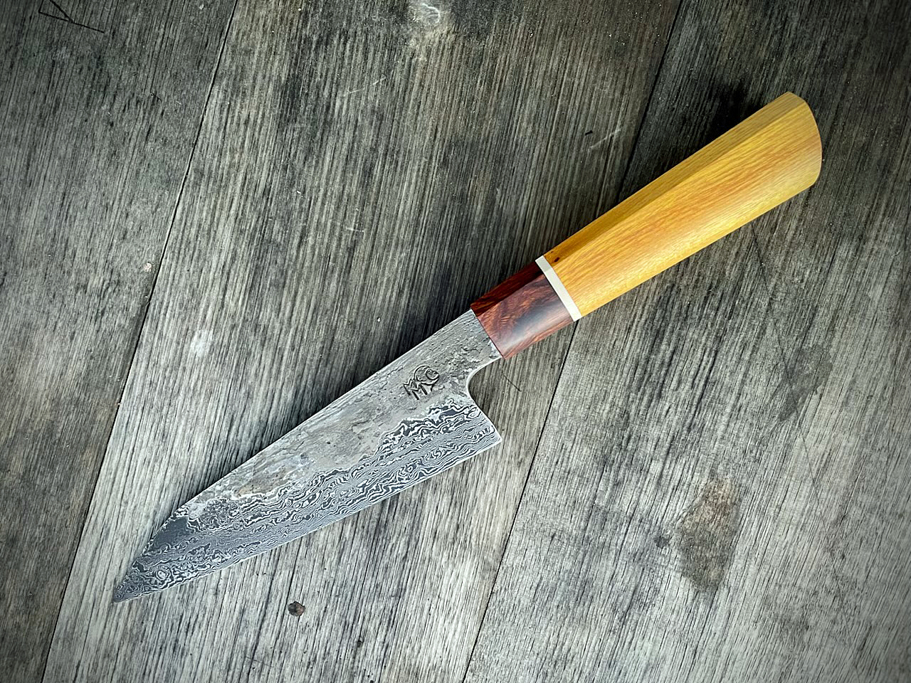 Toby is an accomplished knifemaker from Tassie and he will be teaching you how to forge a Damascus steel billet into an 8-inch blade before sharpening it and then shaping a traditional Japanese Wa style handle, using a durable acacia hardwood.